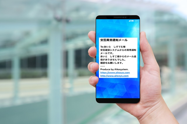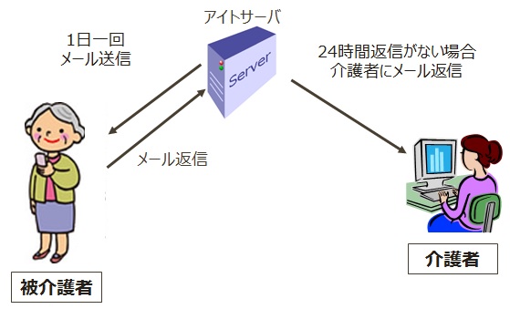 介護者及び被介護者のメールアドレスを登録しておきます。 被介護者に対してアイトシステムのサーバから1日1回メールを送信し、被介護者はそのメールに対して空メールの返信を行います。 最大24時間以内に返信がない場合は、介護者に対して異常通知メールを送信します。