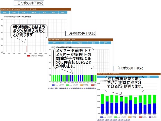一日の時間単位、一月の日単位、一年の月単位、更に1年単位でボタンの押下状況がグラフで表示されます。